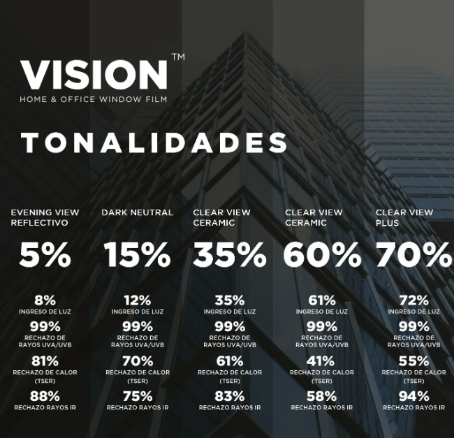 El film para ventanas XPEL VISIONTM puede: ayudar a reducir los costos de energía, aumentar la privacidad de los interiores, proteger del 99 % de los dañinos rayos uv a/uv b, aumentar la comodidad de los interiores